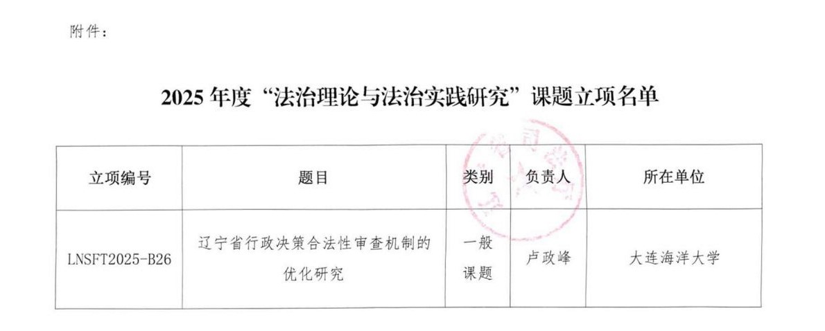 近日,辽宁省司法厅公布2025年度“法治理论与法治实践研究”课题立项名单,公司卢政峰副教授申报的《辽宁省行政决策合法性审查机制的优化研究》课题获批立项。