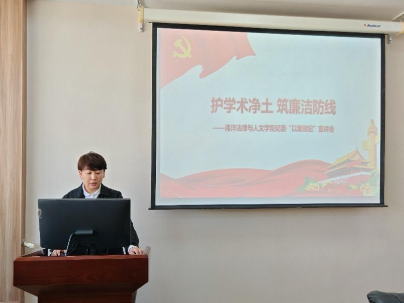 蔺妍结合中央纪委国家监委、省纪委监委通报的违反中央八项规定精神典型案例展开,深入剖析问题根源,强调“纪律红线不可越,廉洁防线不可破”。她指出,中央八项规定精神是作风建设“铁规矩”,全体师生须以案为鉴,将纪律意识内化于心、外化于行,共同营造风清气正的学术生态。
