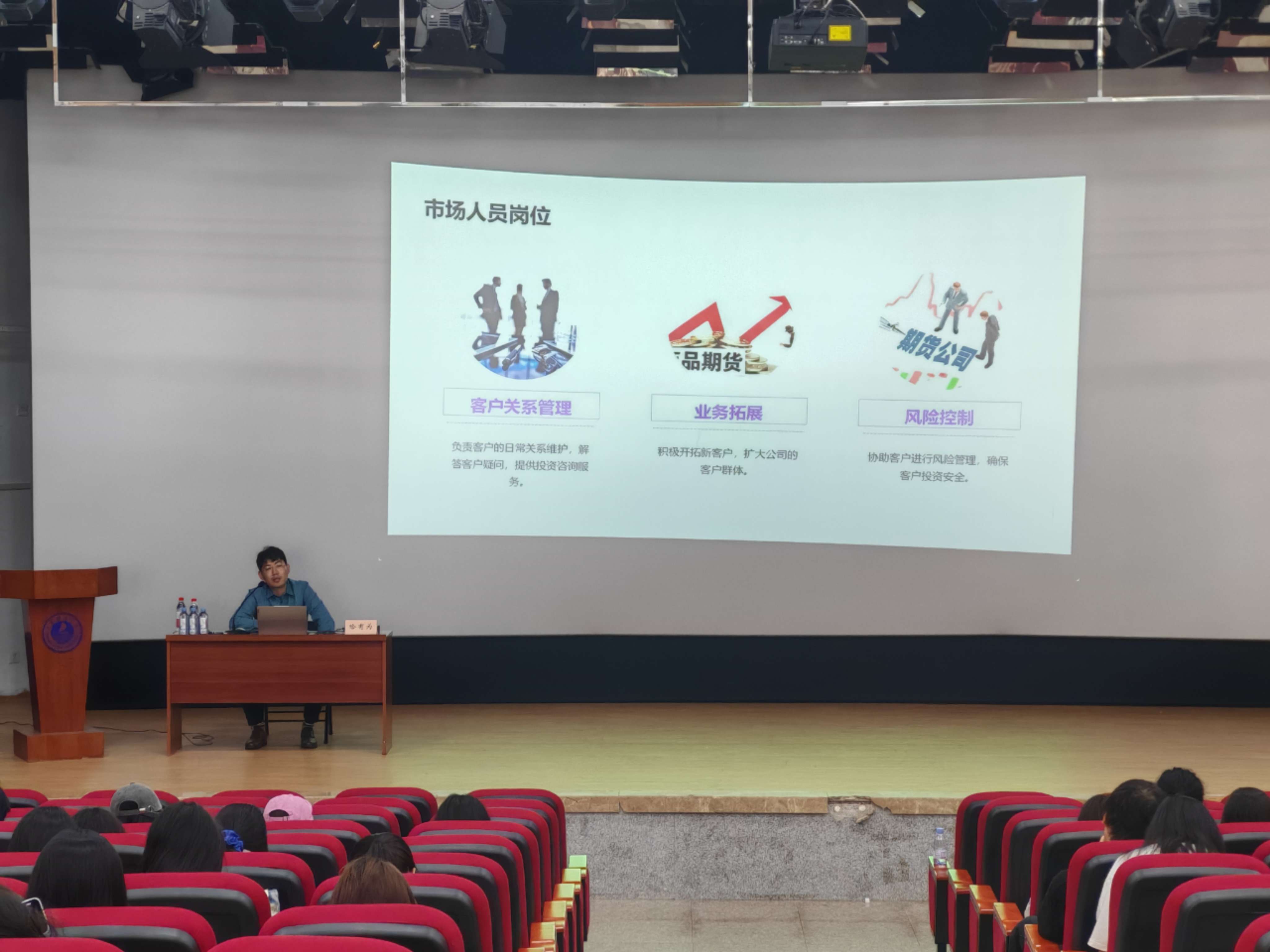 宣讲会上,哈有为围绕期货期权知识展开讲解,详细介绍了市场人员岗位、客户关系管理、业务拓展以及风险控制等内容,向公司员工普及金融知识,提升员工对期货期权的认知,为同学们搭建起理论与实践相结合的金融学习平台。同学们积极参与互动问答,现场氛围热烈。