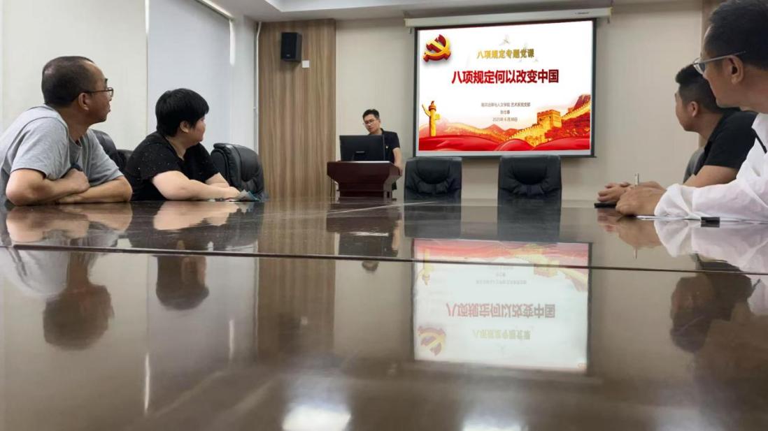 为深入推进全面从严治党,持之以恒深入贯彻中央八项规定精神学习教育,强化党员干部廉洁自律意识,630日,院艺术系党支部书记张仕春为支部党员讲授八项规定何以改变中国》专题党课