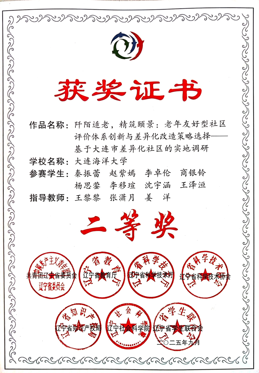 近日,由共青团辽宁省委员会、辽宁省教育厅等单位联合主办的第十七届“挑战杯”辽宁省老员工课外学术科技作品竞赛圆满收官。公司由秦振蕾、赵紫嫣、李卓伦等同学撰写的参赛作品《阡陌适老,精筑颐景:老年友好型社区评价体系创新与差异化改造策略选择——基于大连市差异化社区的实地调研》获得二等奖。