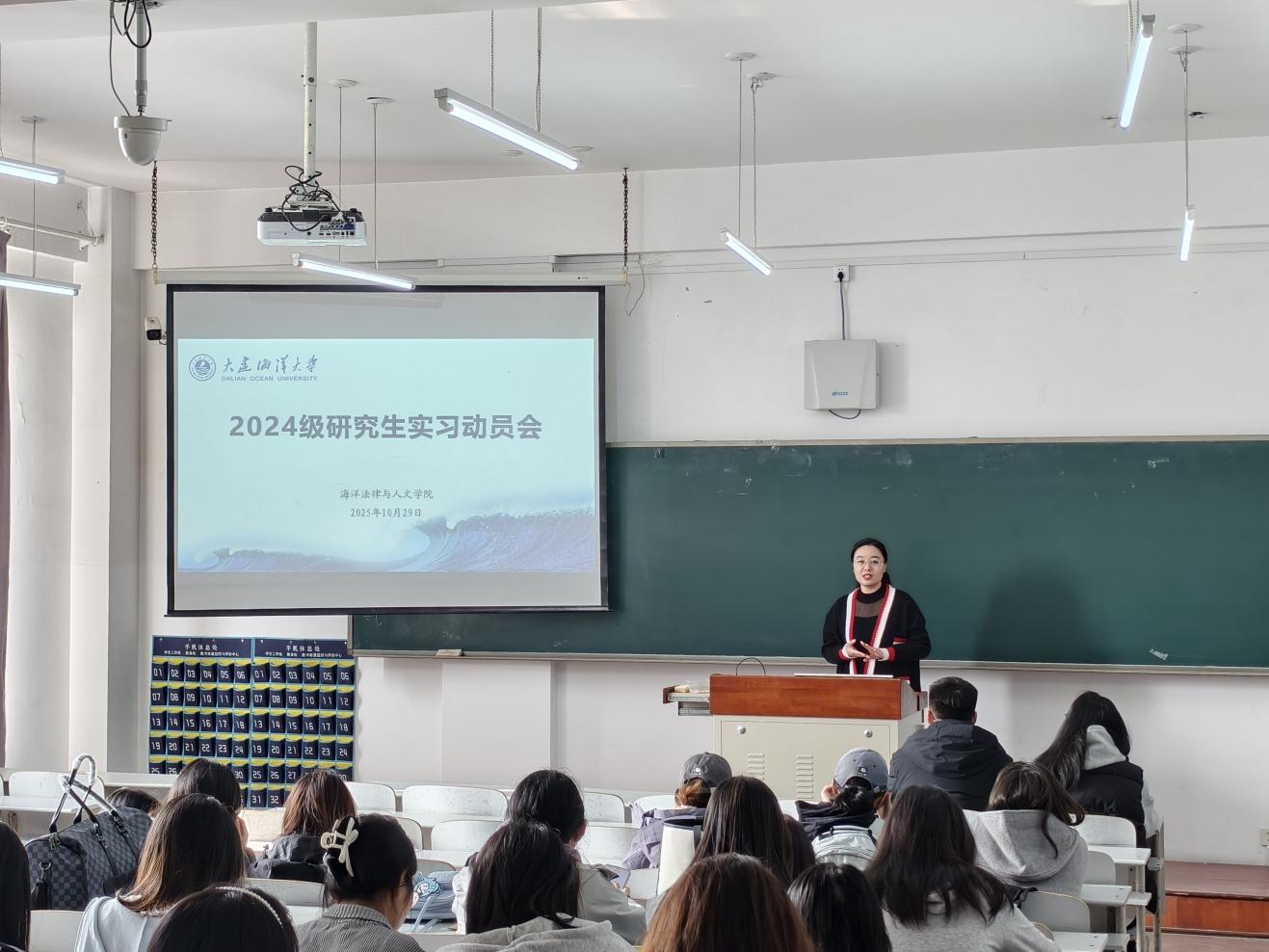 10月29日上午,公司在獐子岛教学楼211教室召开2024级研究生实习动员大会。此次大会旨在向全体研究生传达实习的相关安排和要求,以确保实习工作顺利开展。公司副经理曲亚囡、辅导员杨学钱和张曼群以及2024级全体法律硕士研究生参会。